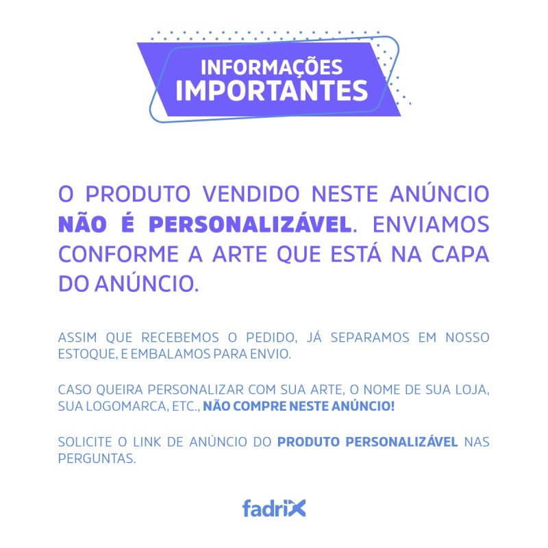 + Caso já tenha sua arte para nos enviar, assim que efetuar a compra, anexe sua arte em MEUS ARQUIVOS direto em sua conta. Enviamos também o gabarito e as instruções para auxiliar caso precise, nos solicite pelo chat da compra.
